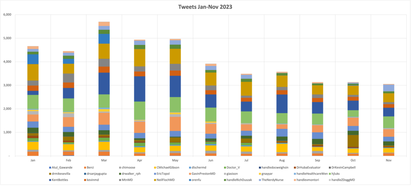 Here’s a look at the total and individual volume of Tweets from January to November of 2023 (NOTE: December is often a lighter month for social media activity).